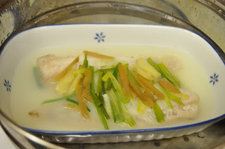 4. Put the fish on a ceramic dish, then put the green onion and the ginger on top of the fish. Then put it into the steamer.